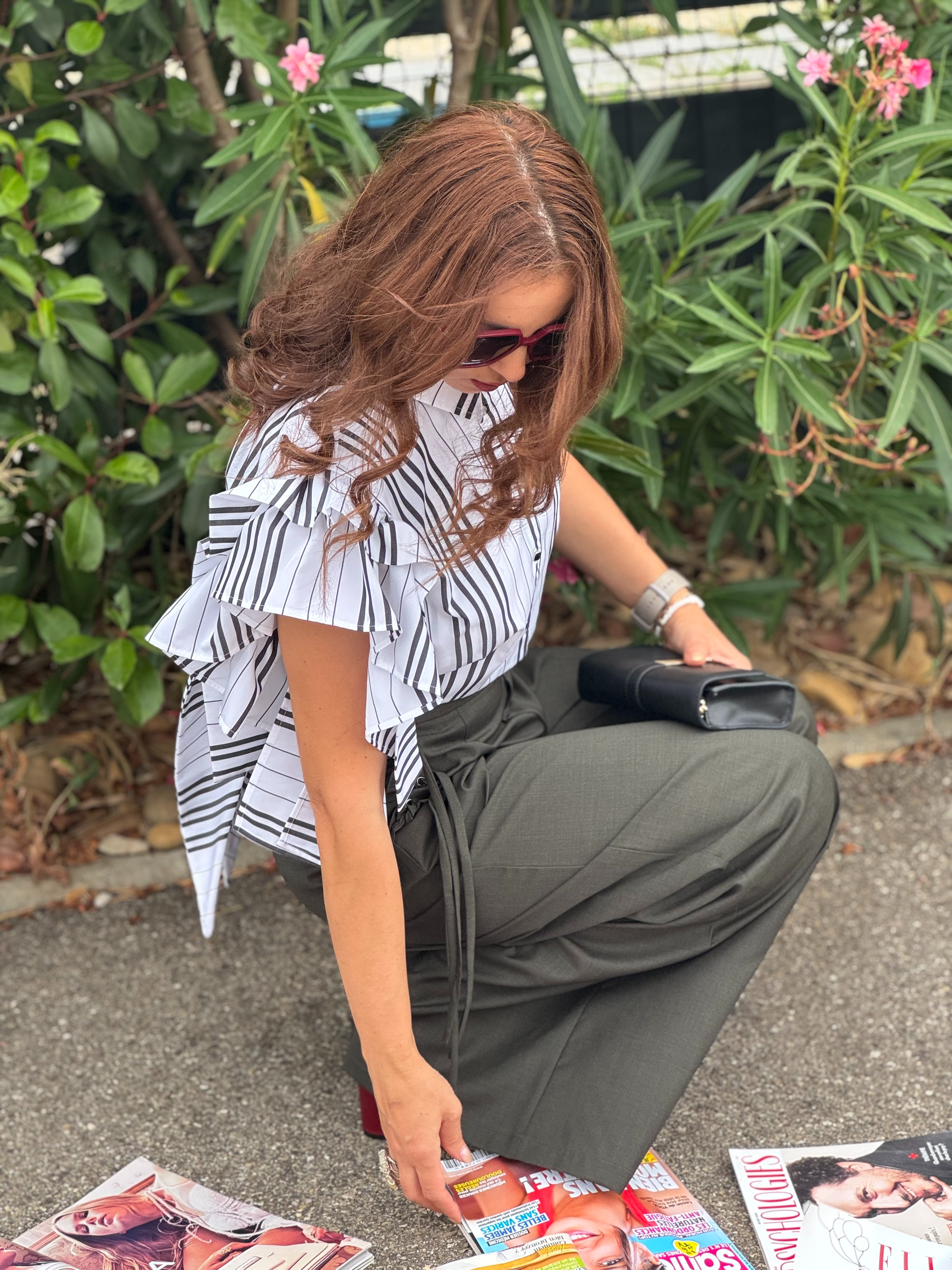 Chemise crop top en coton à manches courtes, rayée blanc et noir, avec un volant décoratif sur une manche pour une touche originale et féminine. Le dos est ouvert et peut se nouer grâce à une large bande en tissu assorti. Boutons noirs sur le devant pour un style élégant et moderne.