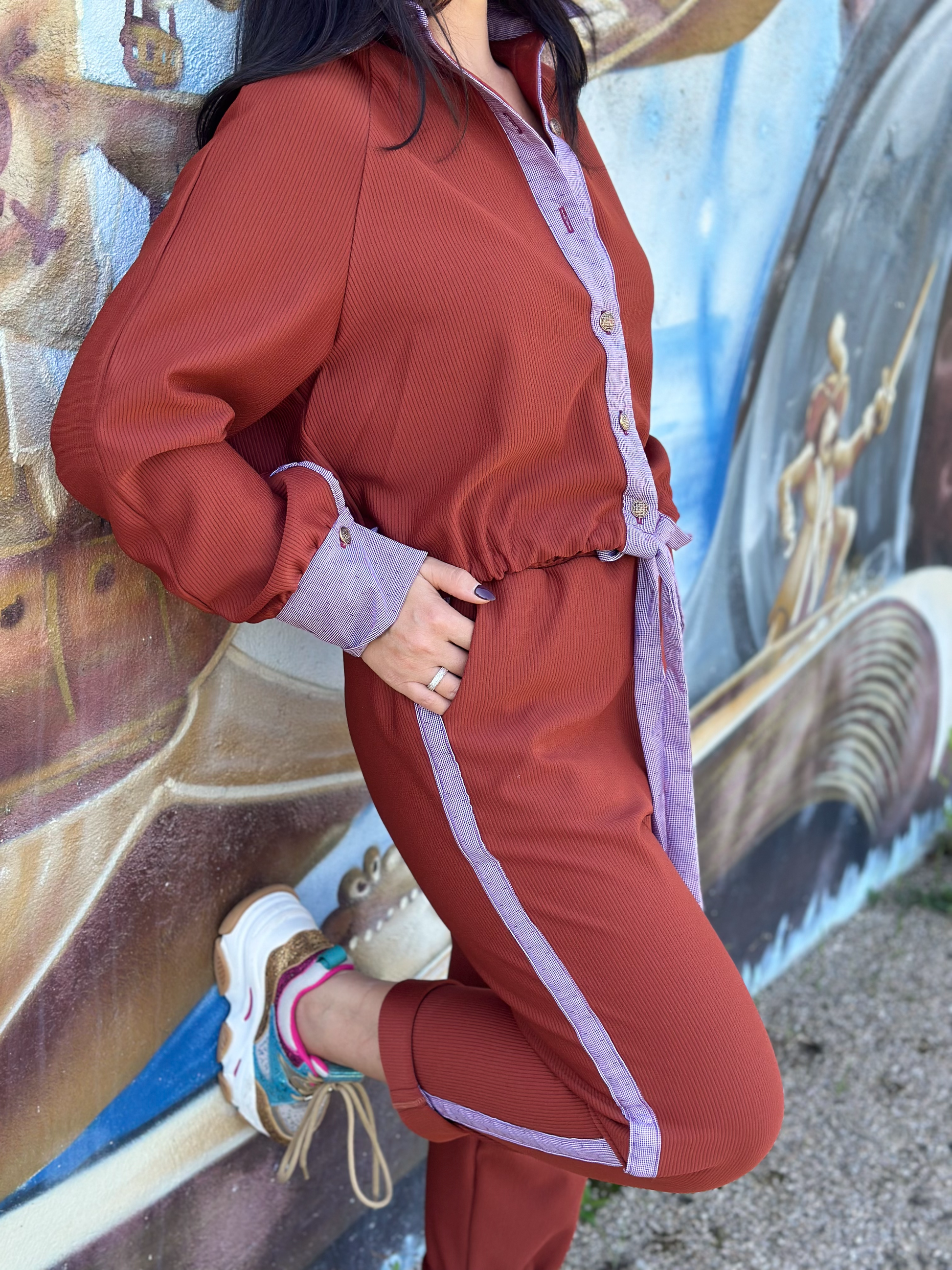 Ensemble en jersey couleur brique/rouille, composé d’un pantalon et d’un haut style chemise sportive. La chemise présente une coupe droite et ample, tandis que le pantalon a une taille élastique avec un lien à nouer. Détails raffinés au col et aux manches de la chemise, et bandes latérales contrastantes sur le pantalon. L’association des matières et des couleurs apporte un design unique à l’ensemble.