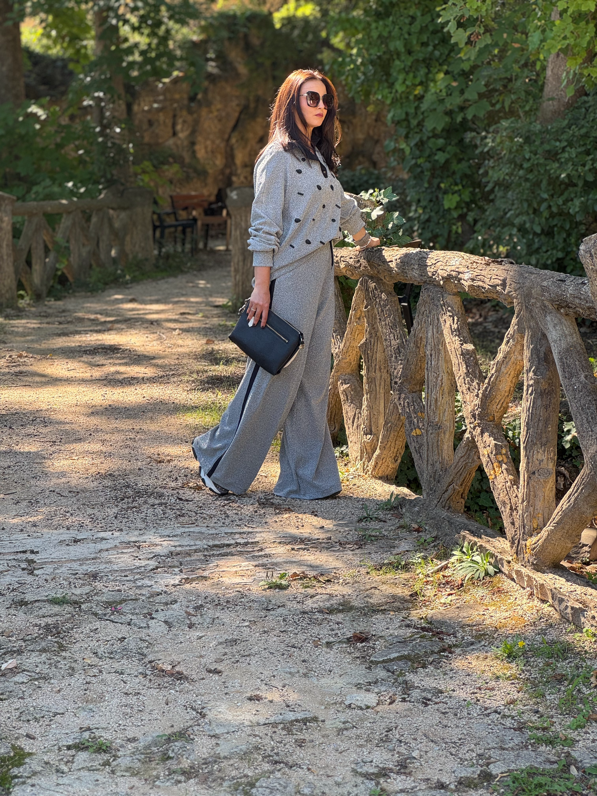 Sweat style chemise et pantalon large droit avec taille élastique et cordon. Détails : bandes latérales noires, perles noires brillantes sur le sweat et aux poches du pantalon. Élégant et confortable.