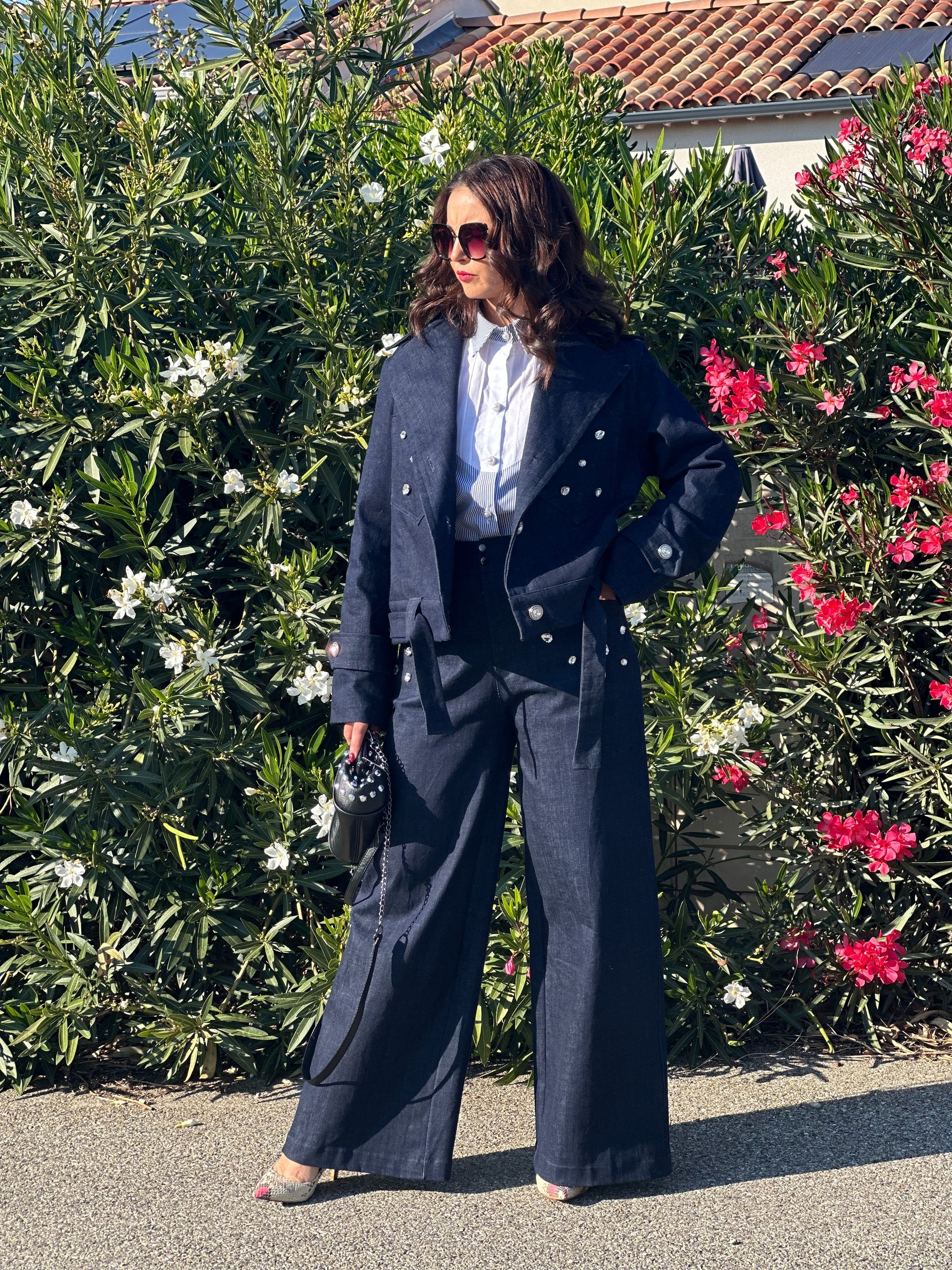 Ensemble veste + pantalon en jean, sublimé par des cristaux cousus à la main sur les poches avant de la veste, sur le détail style trench à l’arrière, et sur les poches mains du pantalon. Chic, moderne et unique.