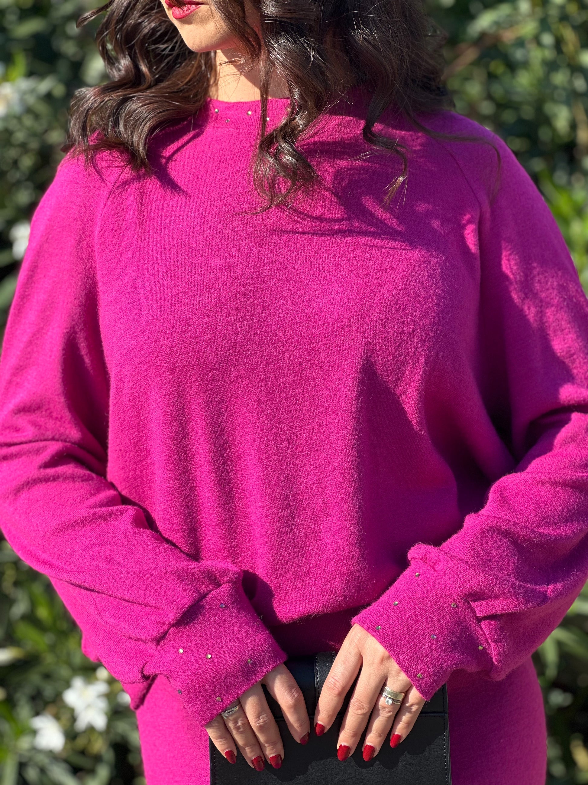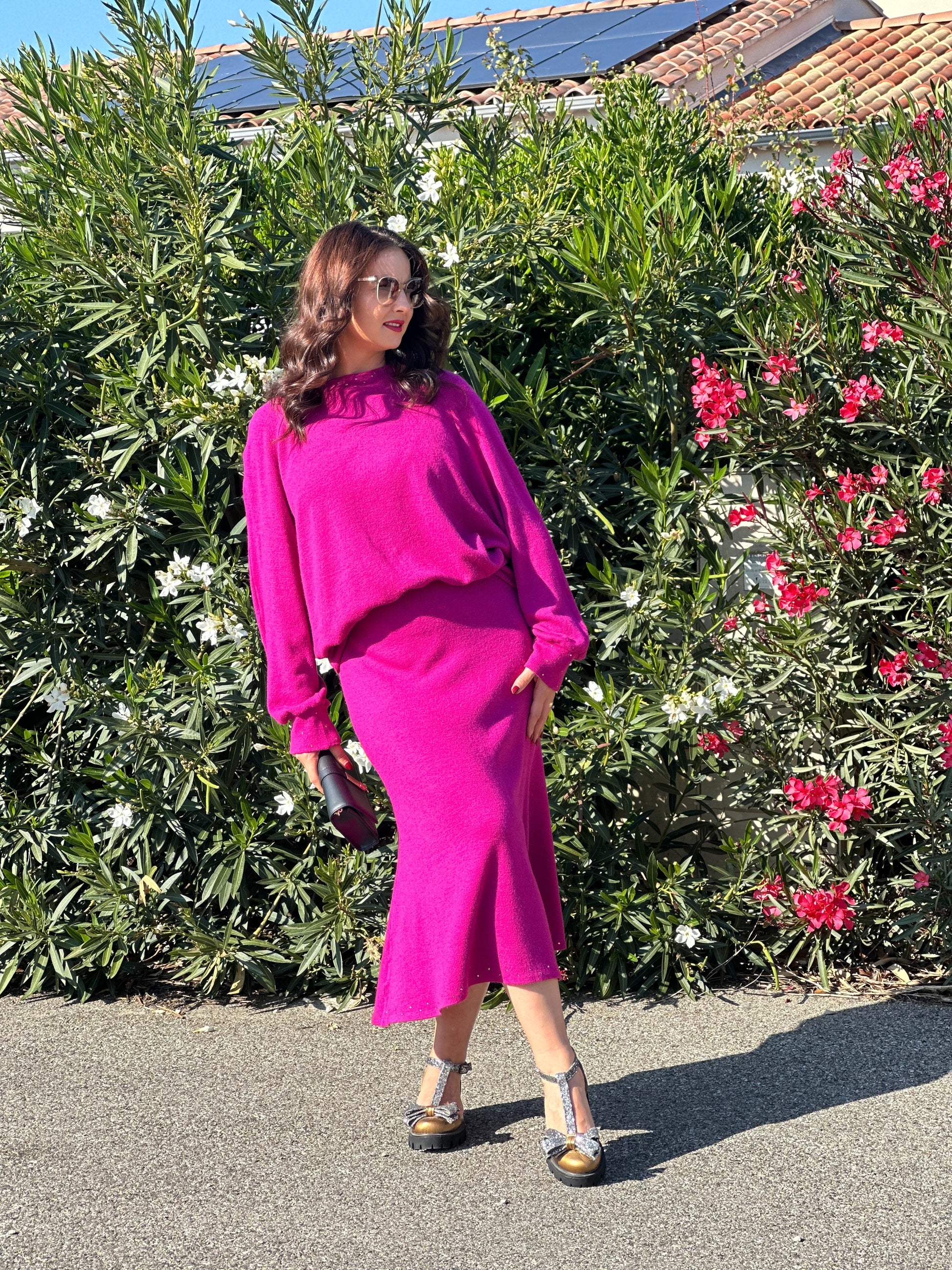 Ensemble confortable et élégant en maille tricot, composé d’un sweat et d’une jupe midi coupe A. Cristaux appliqués à la main sur le col, les manches et la base de la jupe pour une touche de brillance subtile.