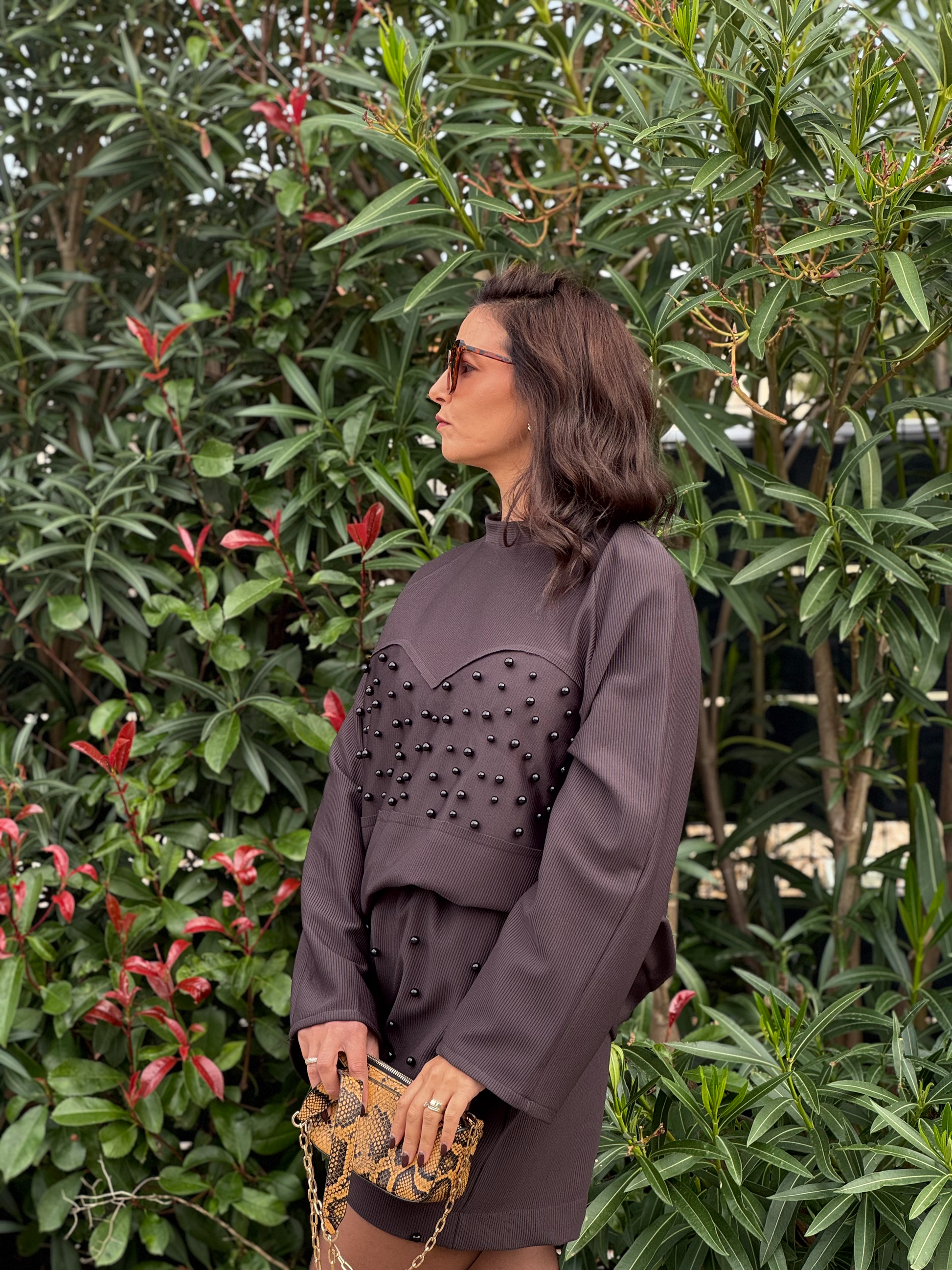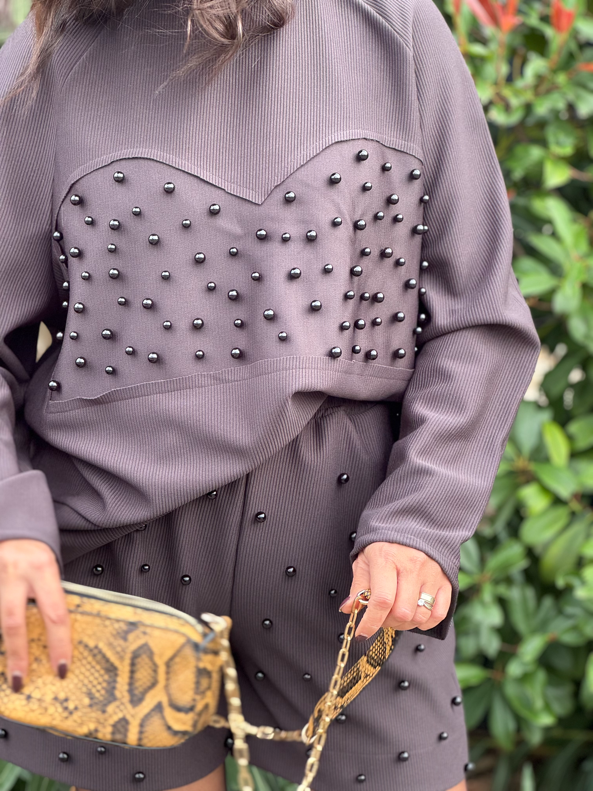 Set confortable composé d’un sweat-shirt et d’un short en jersey. Le short est à taille élastique. Le sweat est décoré de perles noires sur le devant façon corset, et le short présente également des perles sur le devant.