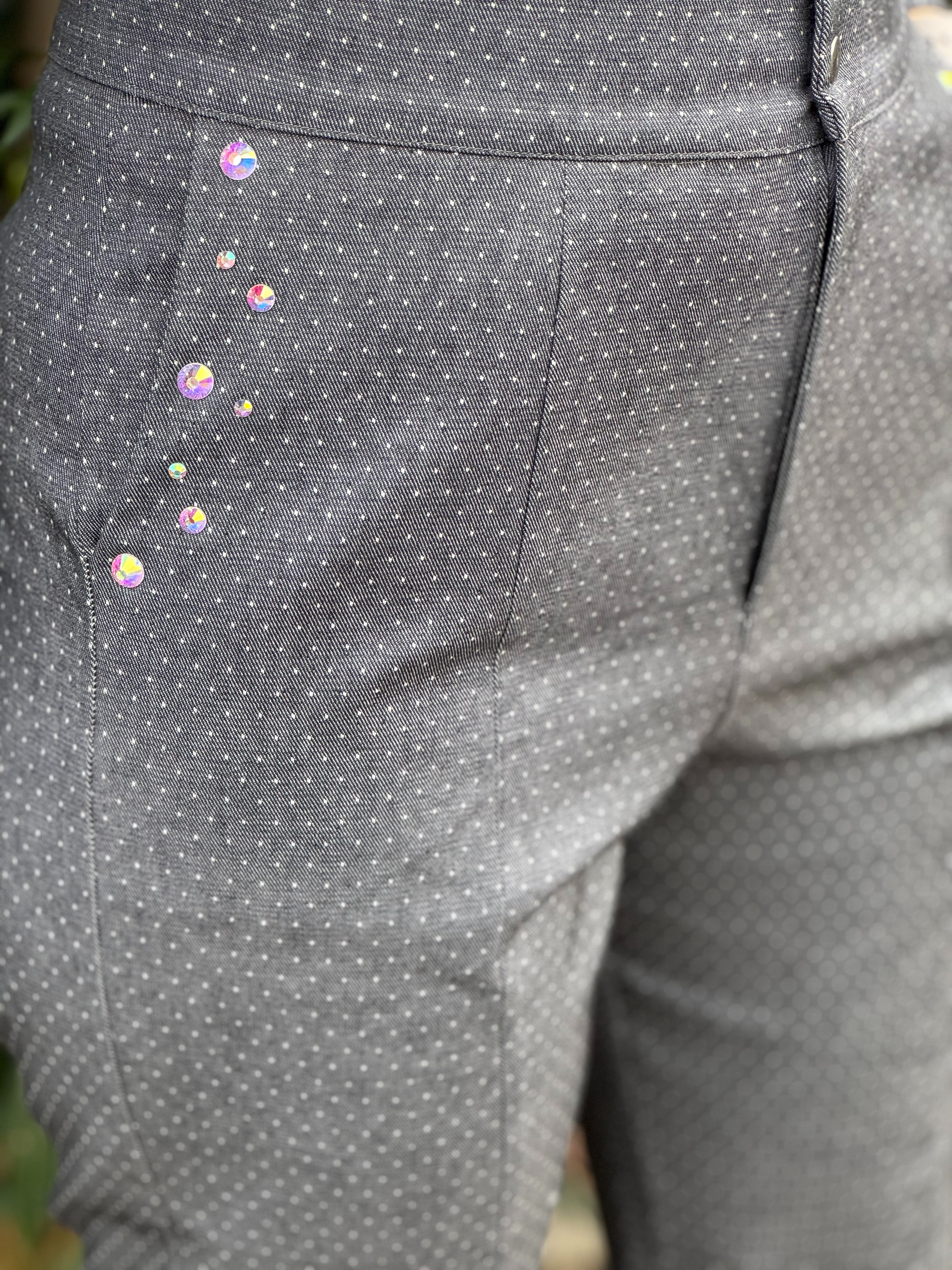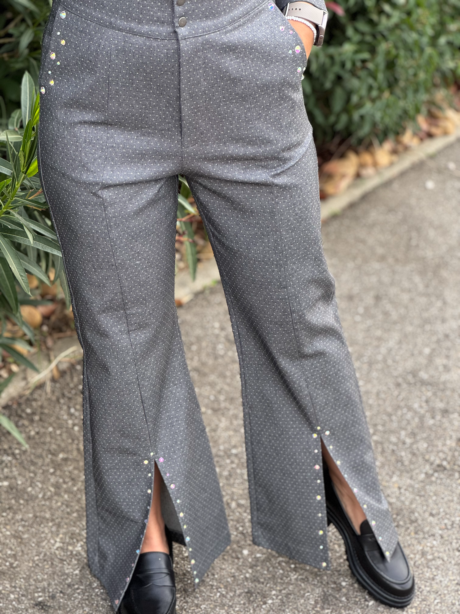 Ensemble en jean gris à petits pois blancs composé d’une veste style chemise longue et d’un pantalon fendu au milieu en bas. L’ensemble est décoré de cristaux multicolores appliqués à la main. La veste possède un cordon à la taille pour marquer la silhouette, tandis que le pantalon est légèrement évasé.