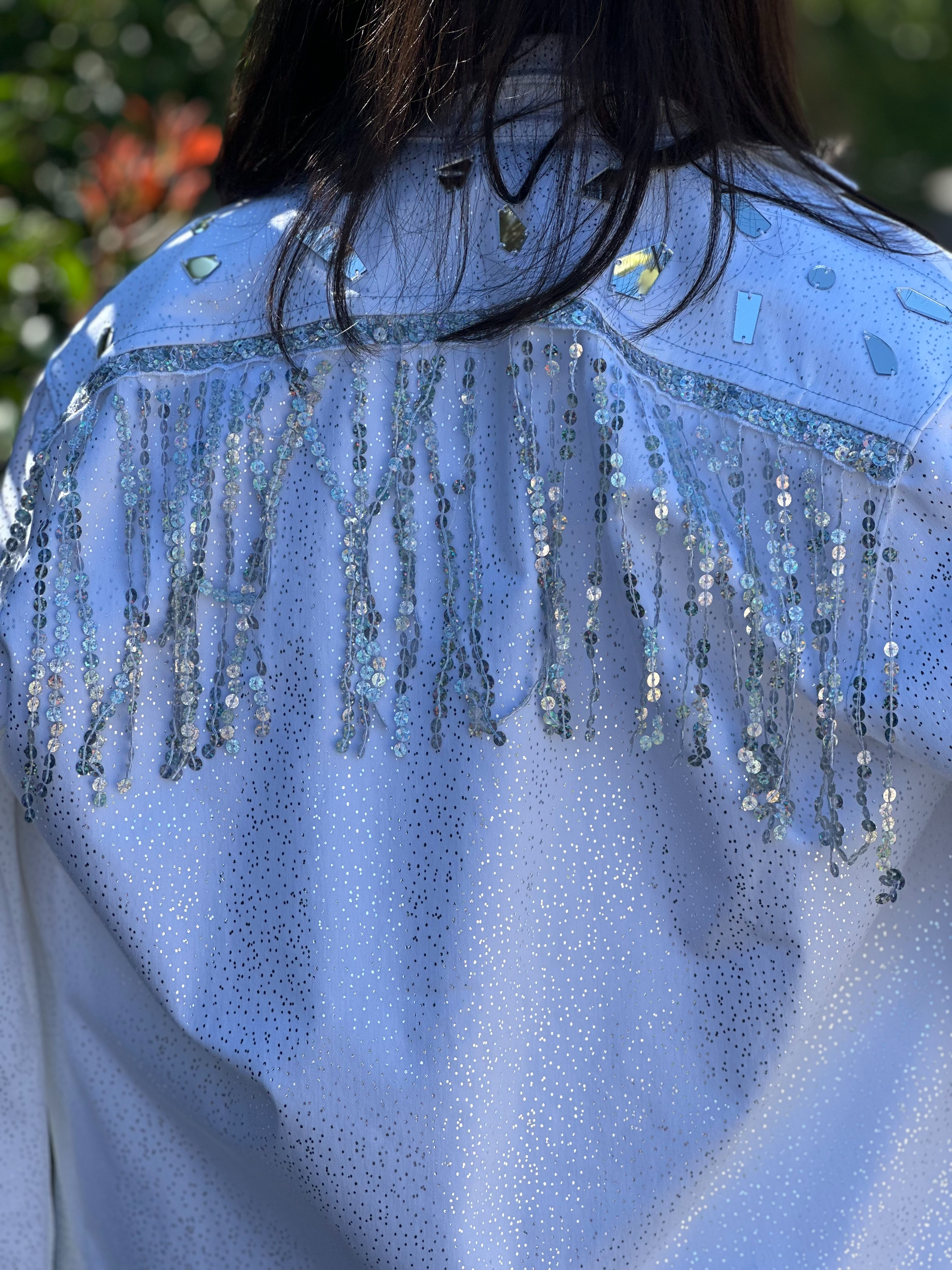 La veste oversize séduit par ses détails uniques : poches sur le devant, décorations en petits miroirs et franges scintillantes en sequins argentés dans le dos.
