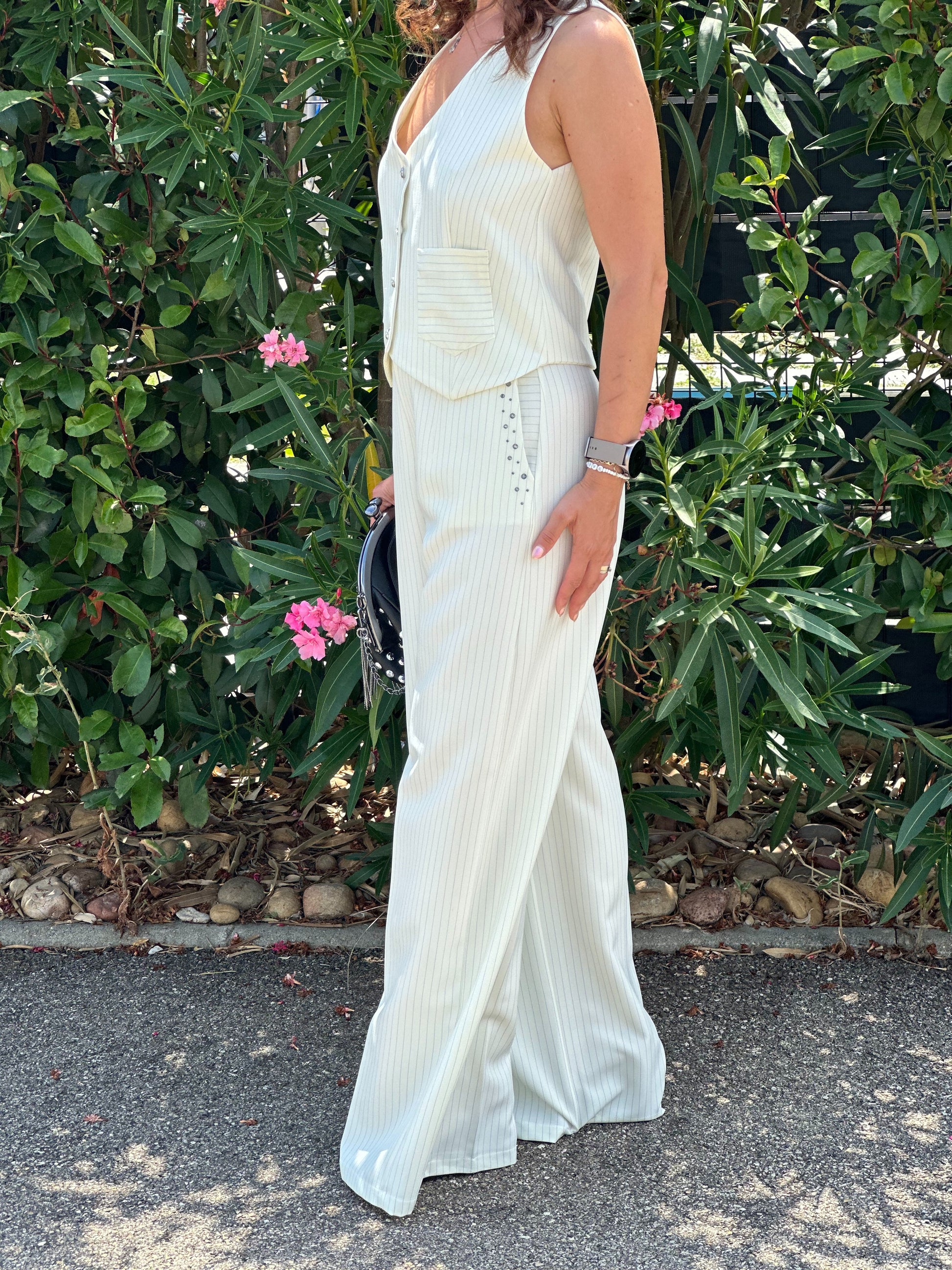 Gilet en polyviscose à fines rayures, couleur ivoire. Il est doté de deux petites poches à l’avant et de boutons argentés ornés de cristaux, apportant une touche raffinée et sophistiquée.