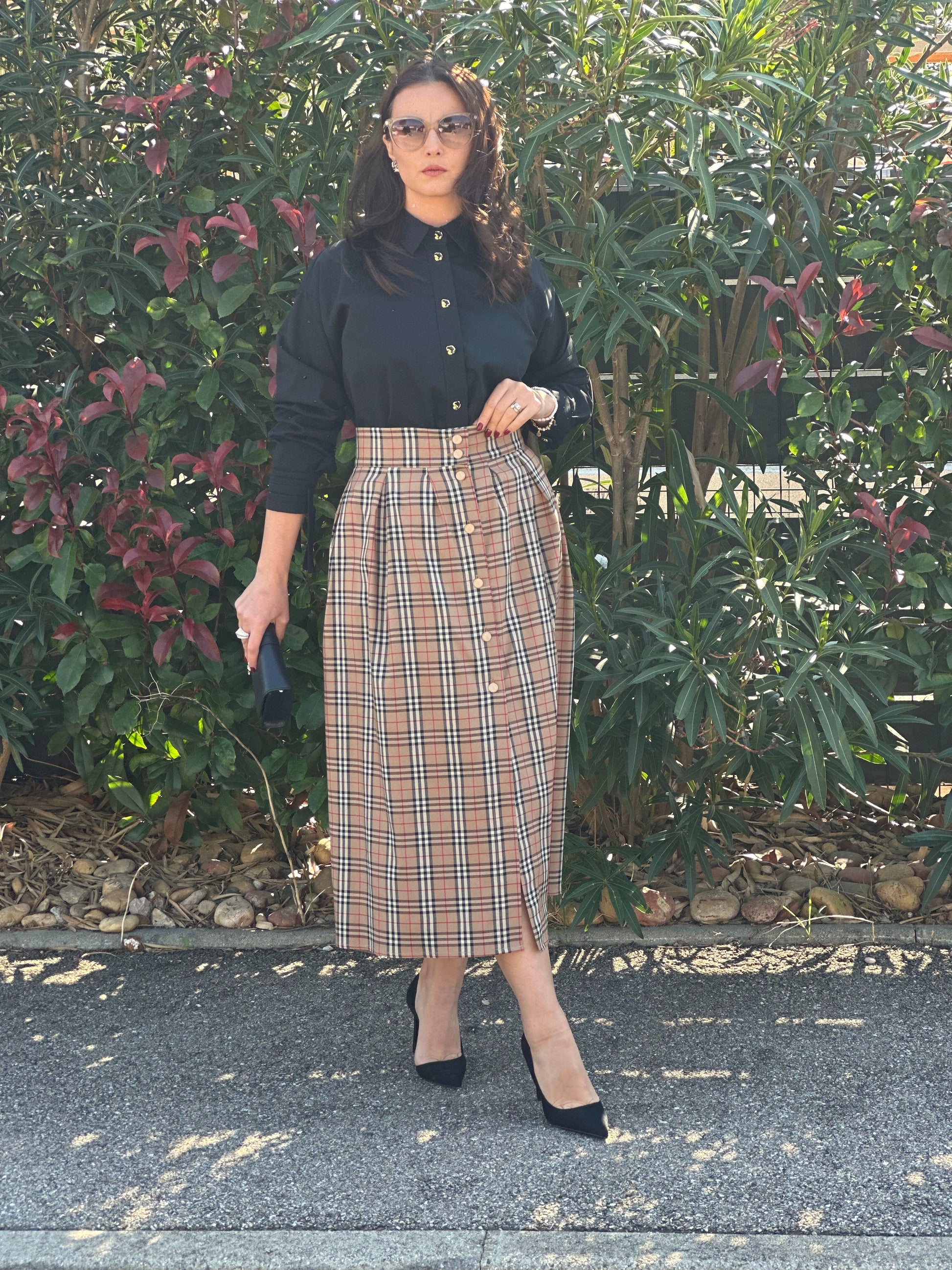 Cette jupe midi en tartan/étoffe à carreaux marron (style Burberry) présente une taille plissée et une coupe évasée style A pour un tombé élégant et féminin. Elle est agrémentée de boutons dorés qui apportent une touche sophistiquée.