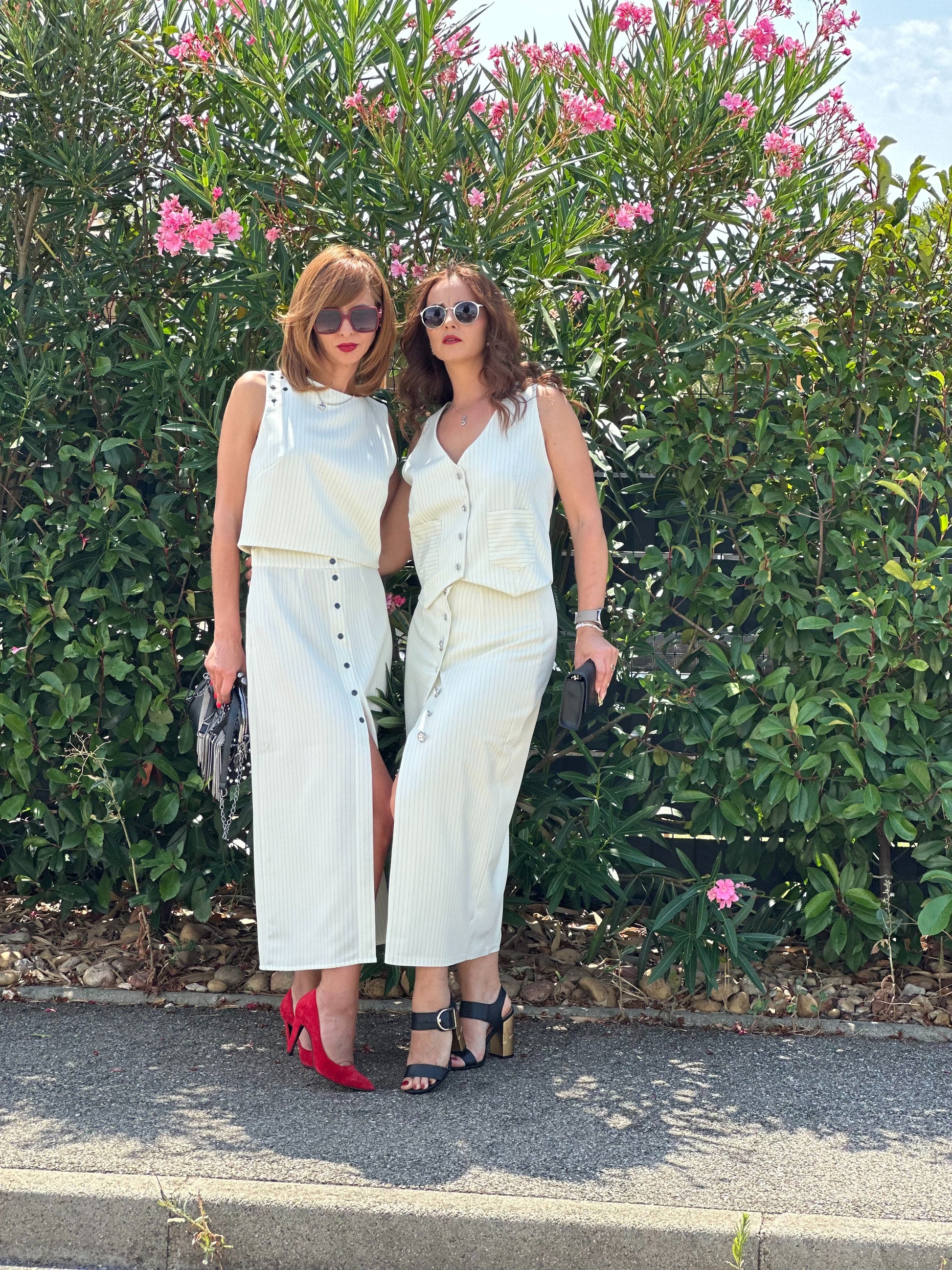 Jupe midi en polyviscose à fines rayures, couleur ivoire, à coupe crayon, doublée pour éviter toute transparence et assurer un confort optimal. Elle se ferme par des boutons disposés selon une symétrie originale, chaque bouton étant unique, et présente une fente délicate à l’avant pour plus de style et d’élégance.