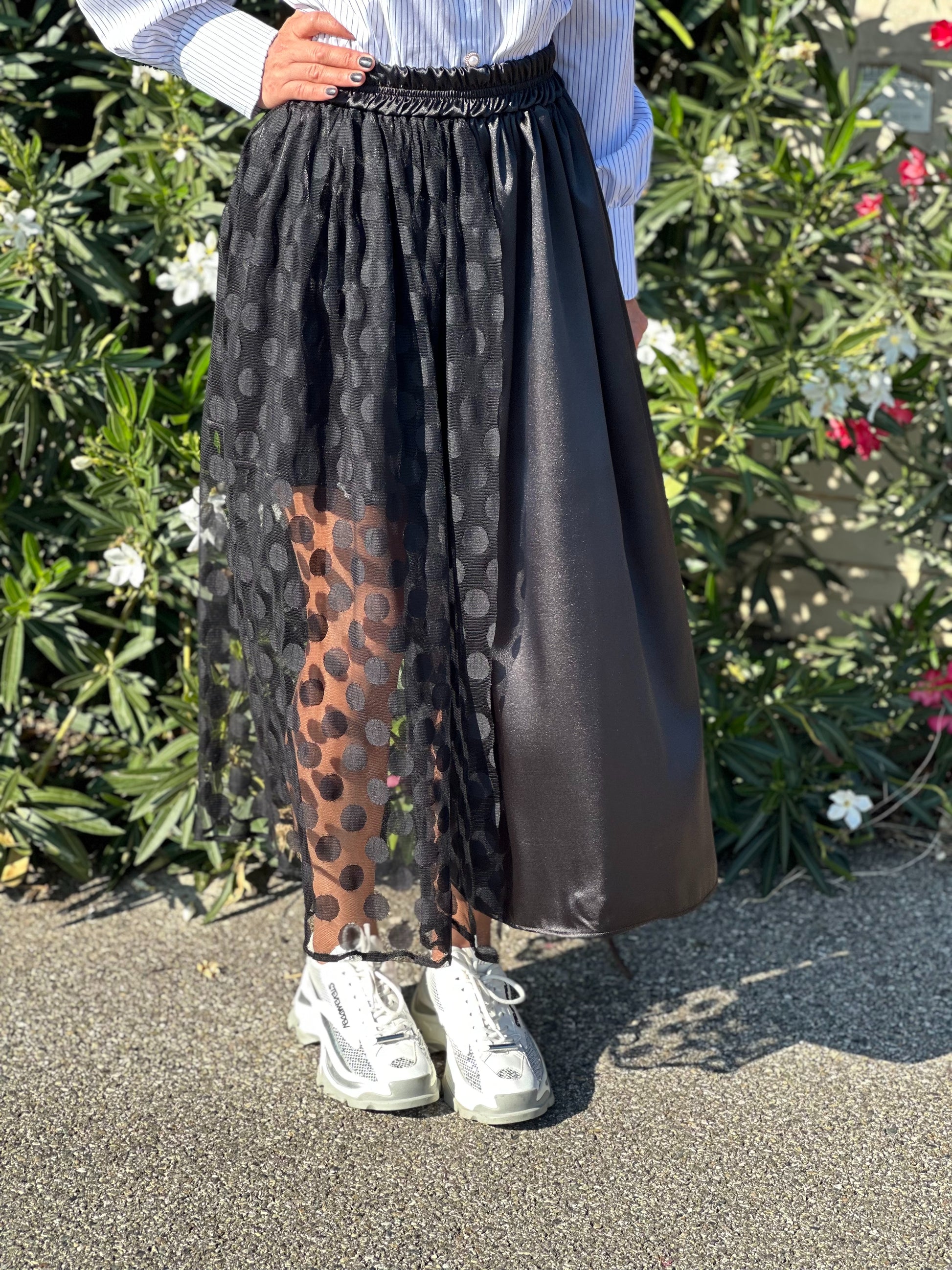 Jupe midi noire satin & dentelle – Un mélange raffiné de satin et de dentelle à pois noirs sur toute la longueur, pour un look chic et féminin.