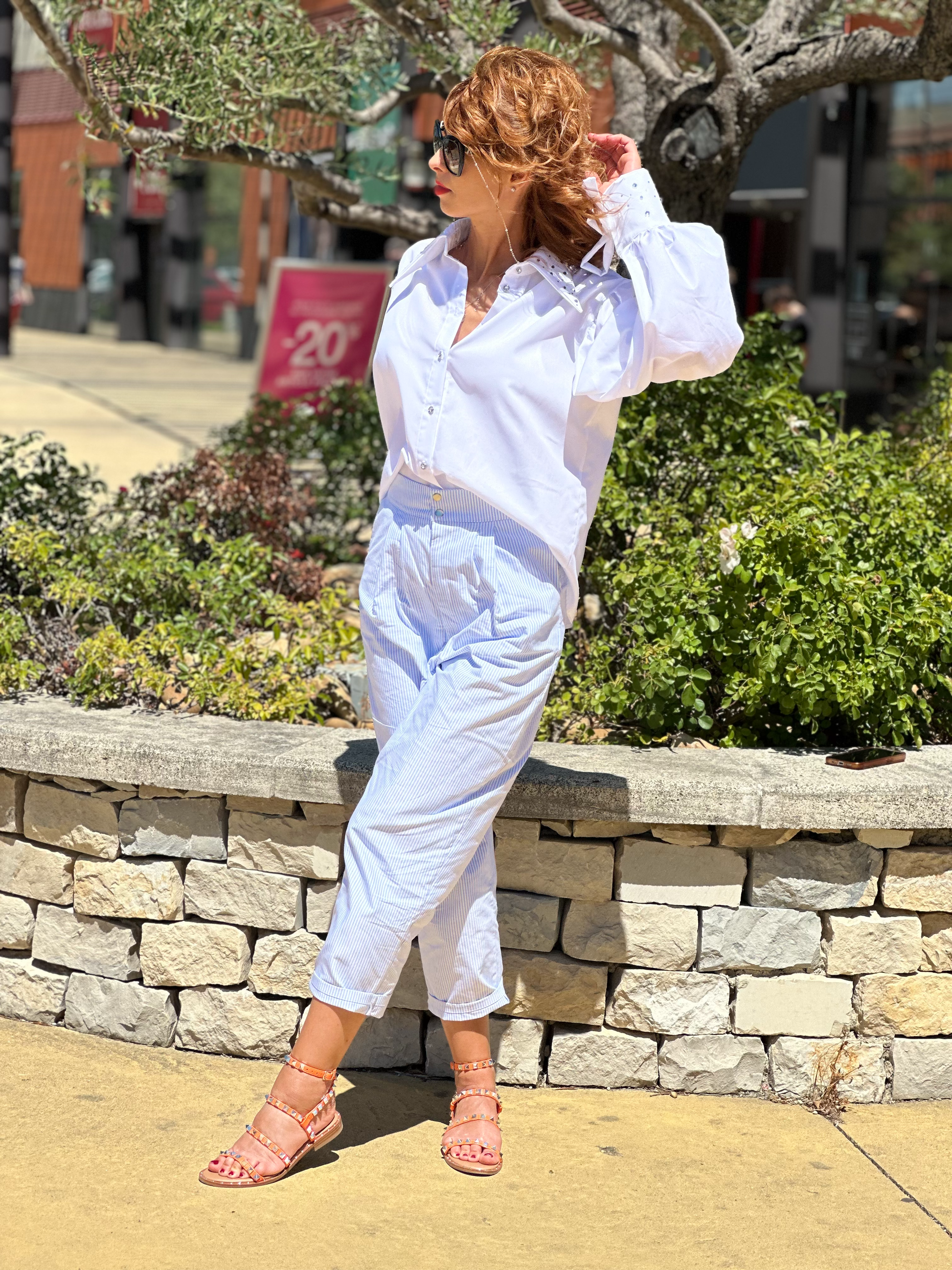 Pantalon à rayures fines bleu clair et blanc, coupe boyfriend, confectionné en polyviscose mélangé coton pour un confort optimal. Il est équipé de poches intégrées discrètes, alliant style et praticité.