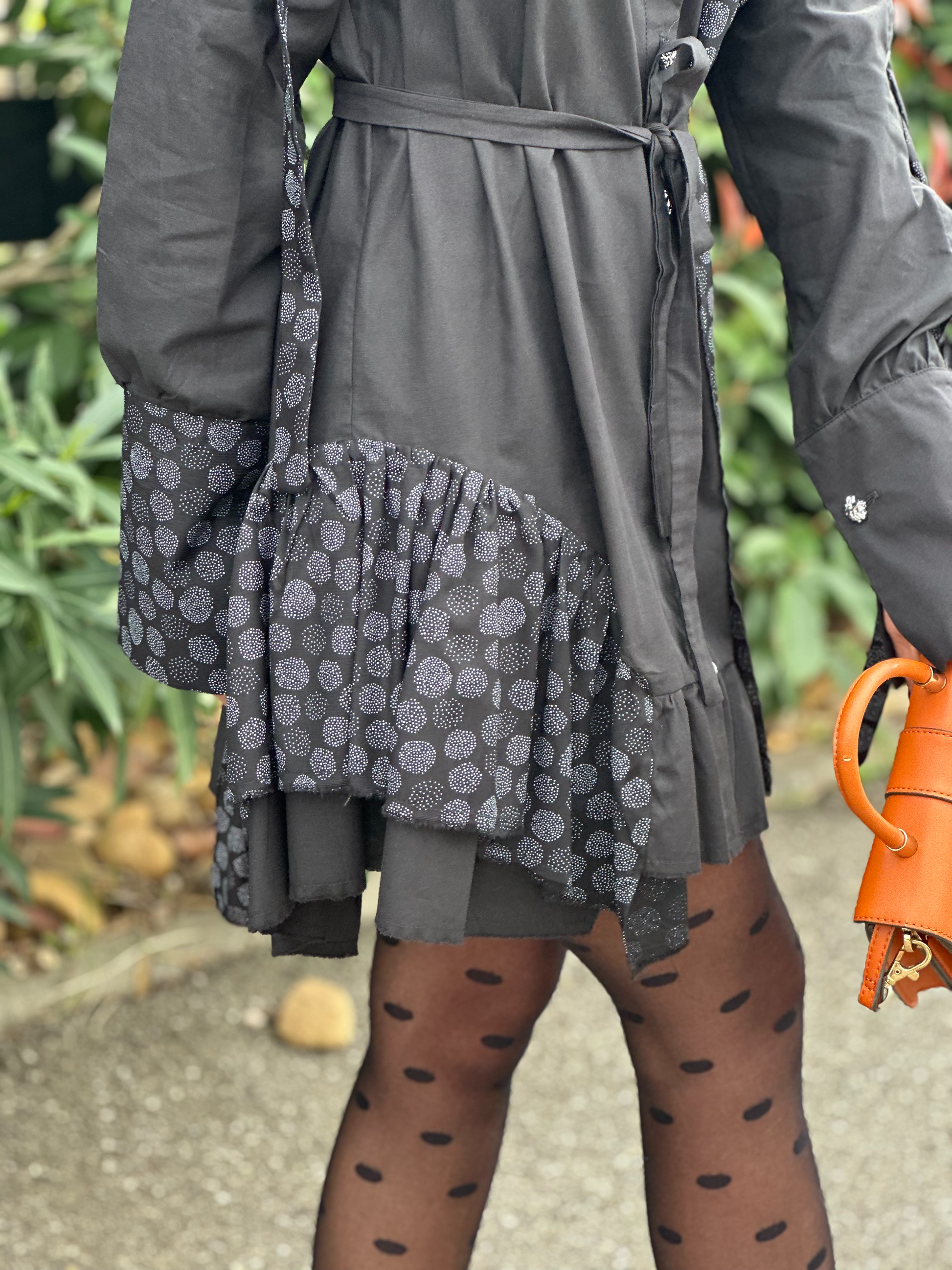 Robe noire style chemise en deux types de coton : un coton noir uni et un coton noir à gros pois. Asymétrique au bas, avec des larges manchettes. Une manche se ferme par un lien en coton à pois assorti. La robe est dotée d’une ceinture en tissu pour marquer la taille.