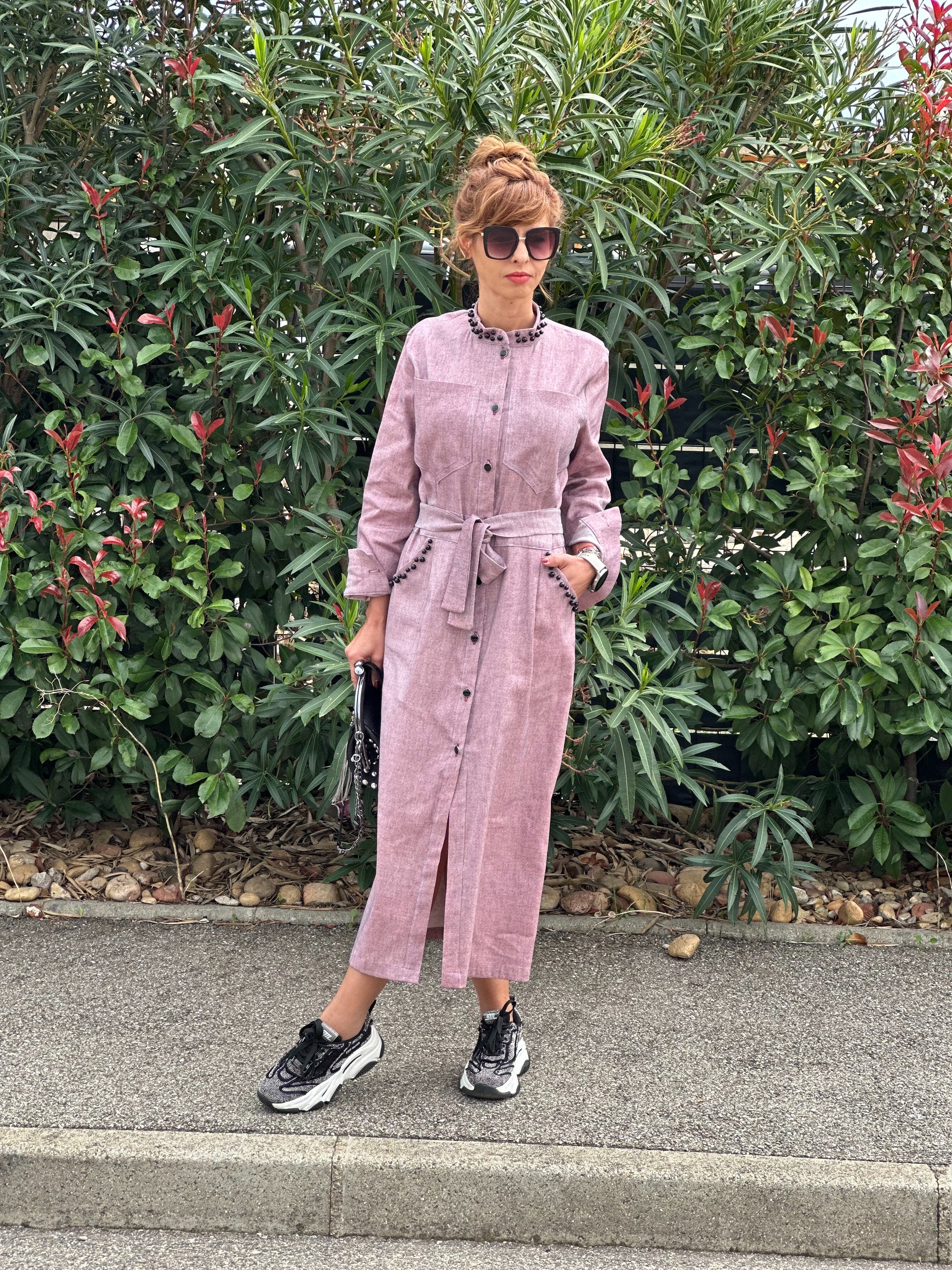 Cette robe chemise midi en denim allie confort et élégance. Elle présente un col tunique, des manches longues avec manchettes, ainsi que des poches intégrées. Des perles noires sont appliquées à la main sur le col et à la base des poches, ajoutant une touche délicate et raffinée. Les boutons sont noirs, harmonisant subtilement le design.