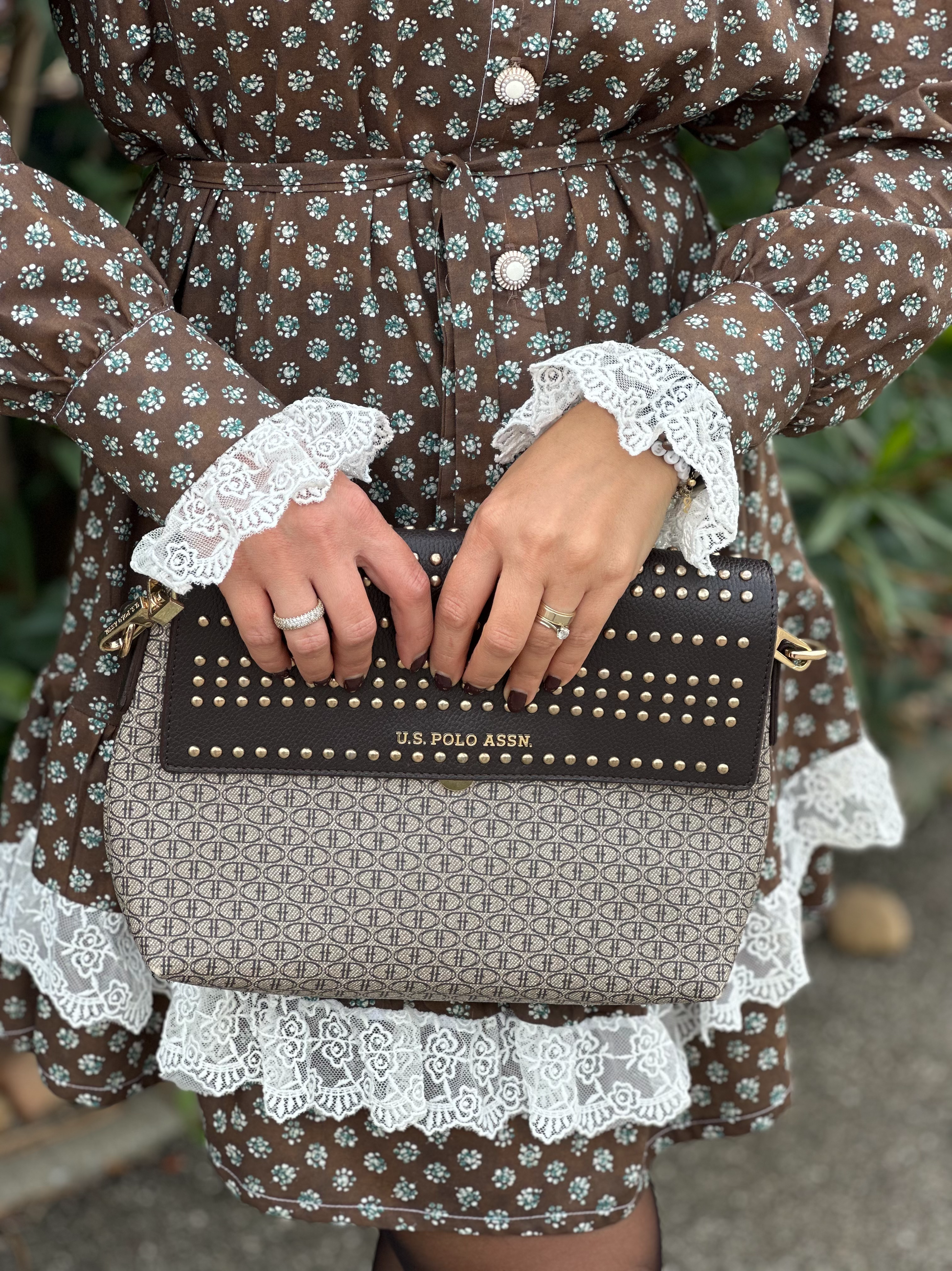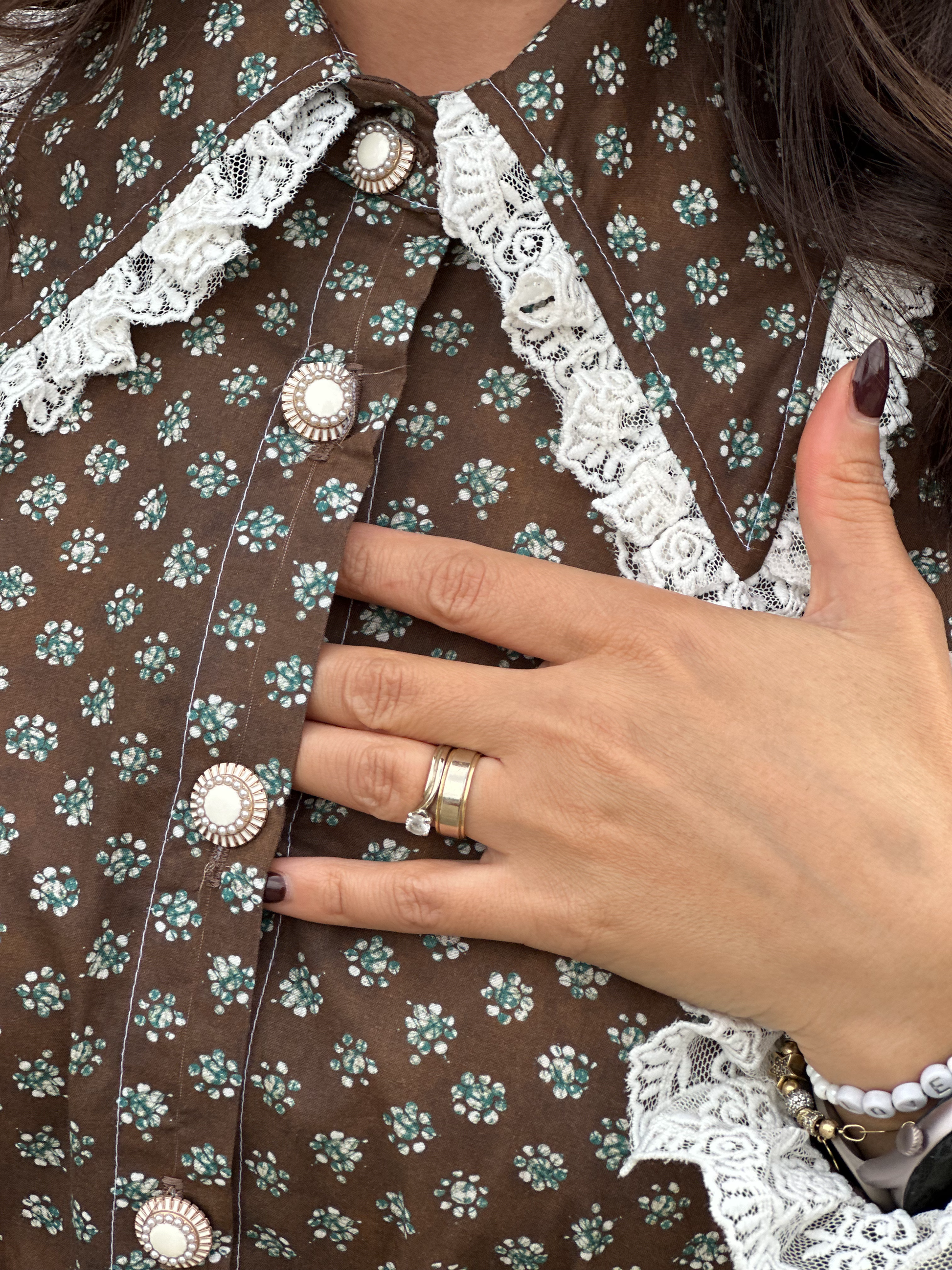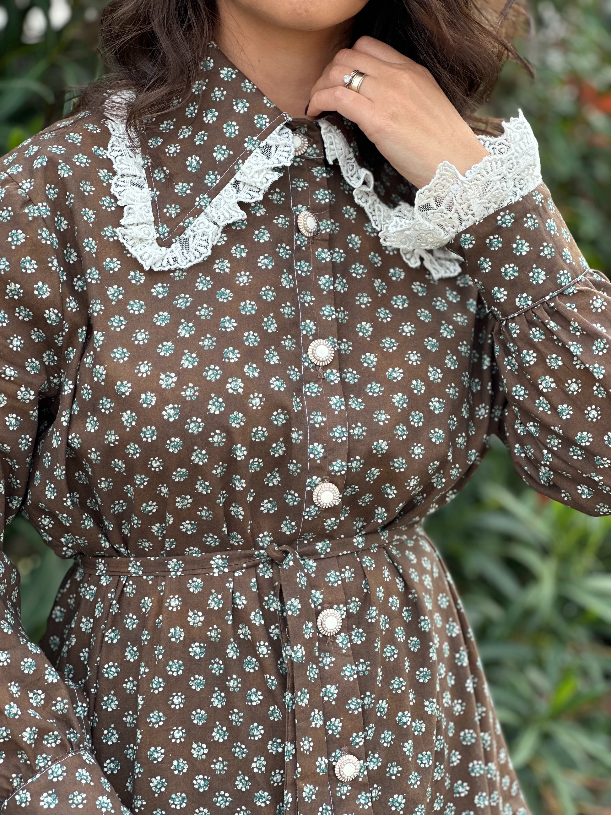 Robe en coton, longueur genou, aux nuances de marron avec des motifs floraux, dotée d’un col chemise. Détails de broderie sur le col, les manchettes et le bas de la robe, qui se termine par un volant légèrement bouffant. La robe est équipée d’un fin cordon permettant de souligner la taille.