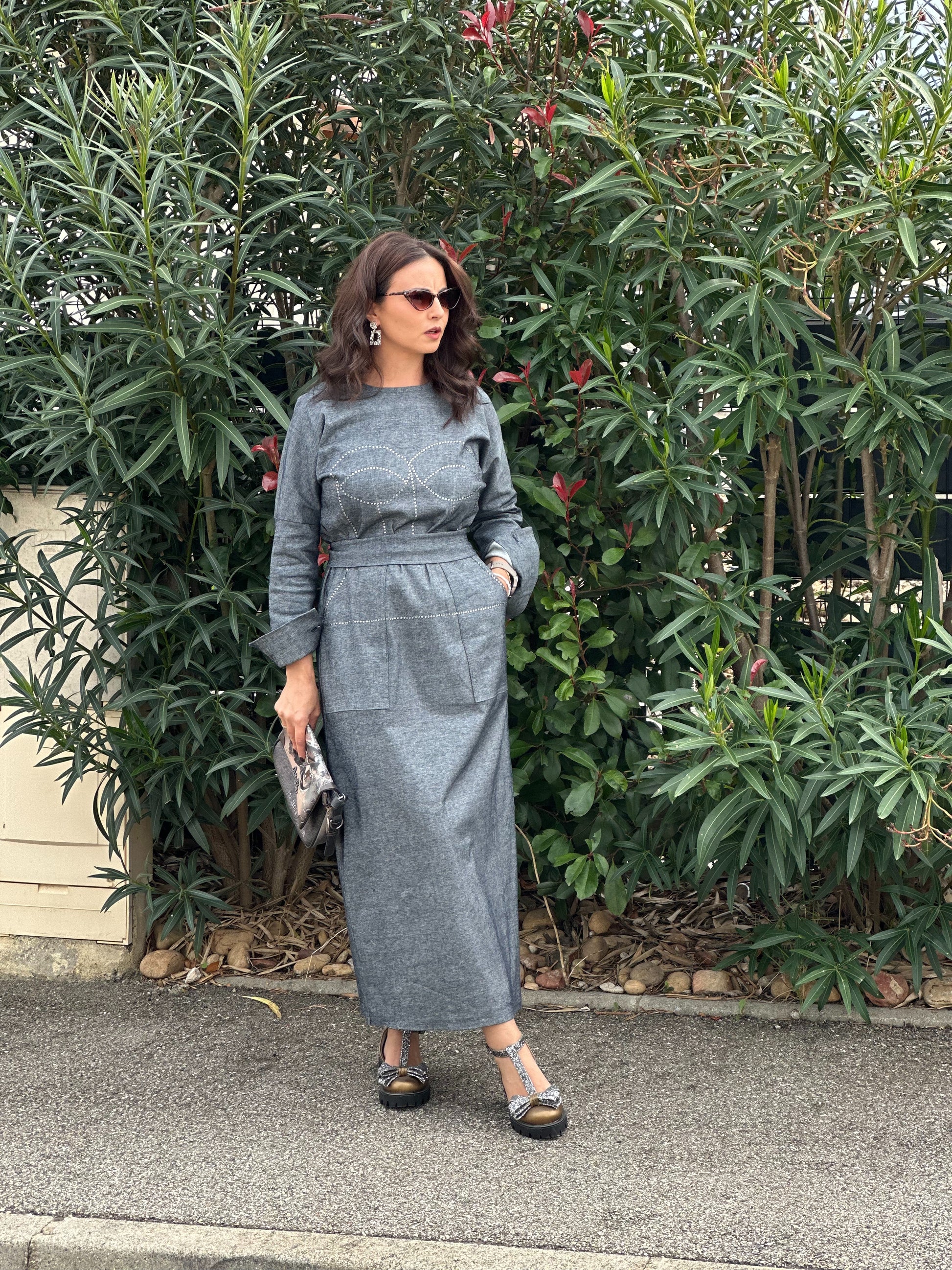 Cette robe allie confort et élégance grâce à son jean gris légèrement extensible. Son design corset, sublimé par des cristaux gris minutieusement posés à la main sur le devant, apporte une touche raffinée et brillante. Les manches se terminent par des manchettes, et la robe dispose de poches à l’avant, tandis que la fente au dos souligne la silhouette avec élégance.