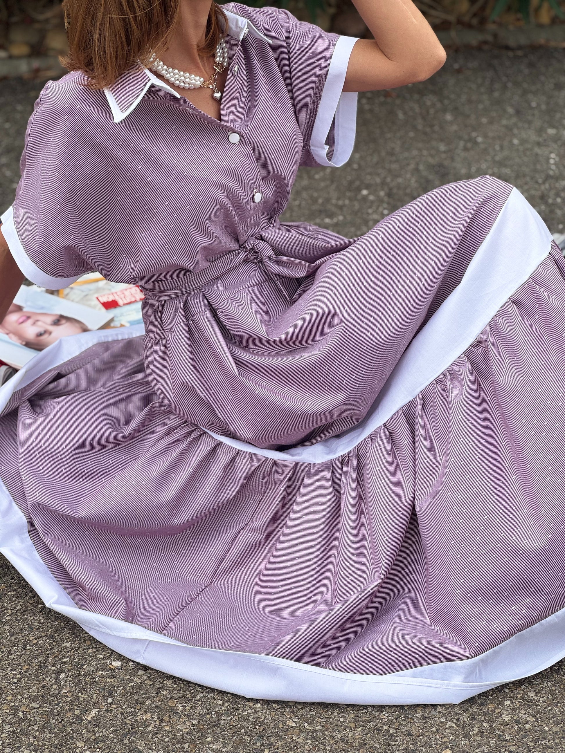 Robe longue en coton bicolore, bordeaux clair et blanc. La partie supérieure adopte un style chemise avec un col double et un cordon à la taille pour souligner la silhouette. Manches courtes, élégante et confortable pour un look chic et décontracté.