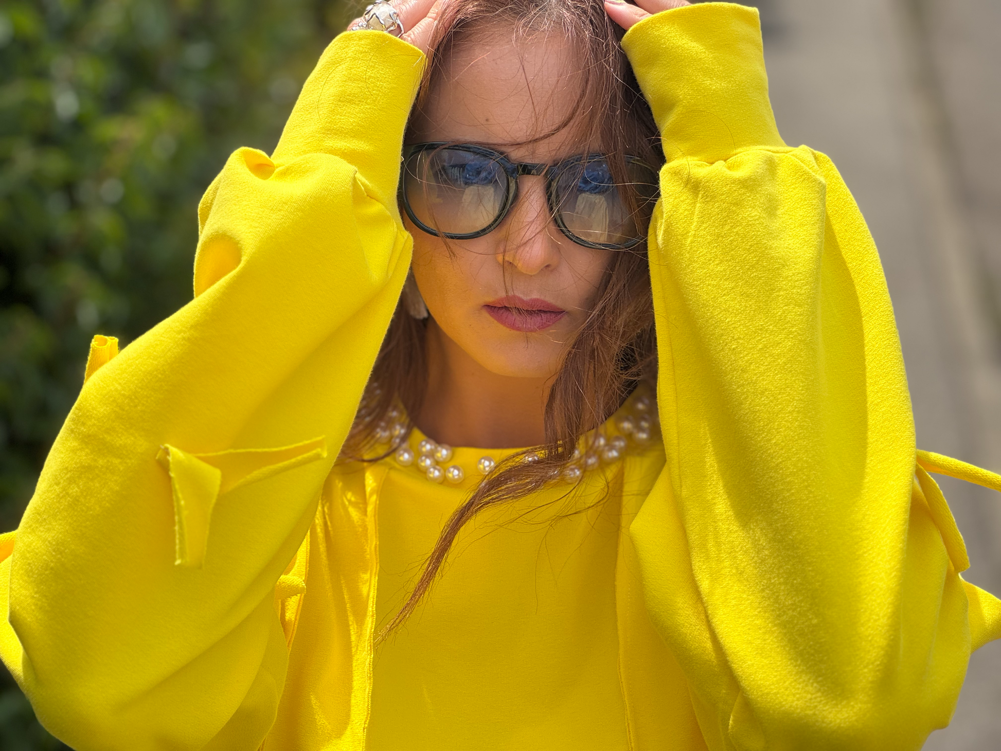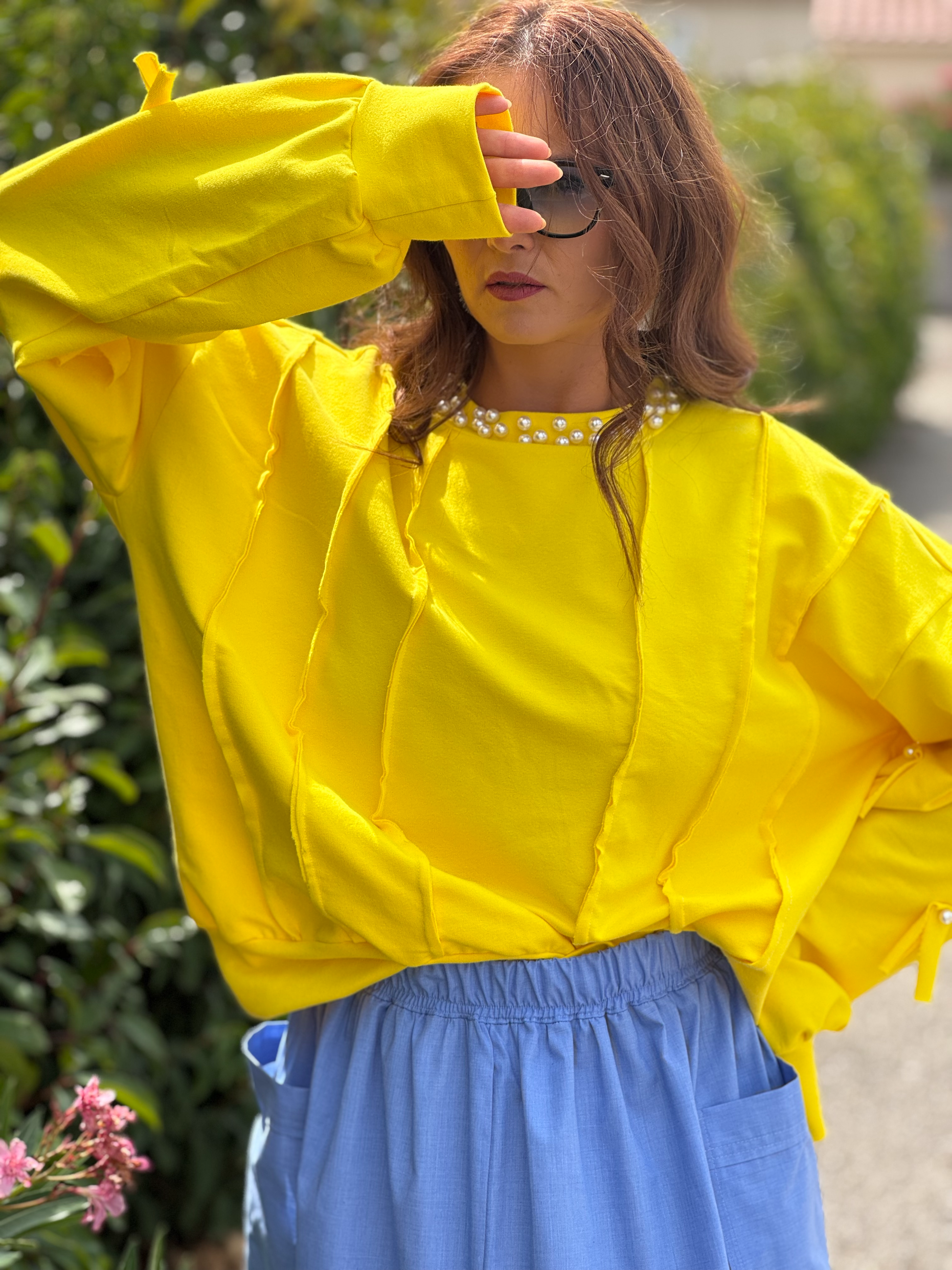 Ce sweat en French Terry, d’un jaune éclatant, se distingue par ses détails raffinés et élégants. Il est orné de perles posées à la main sur le col et sur une manche, ajoutant une touche précieuse et unique. Des bandes de tissu décoratives complètent le design sur le devant et les manches, apportant texture et style à ce modèle confortable.