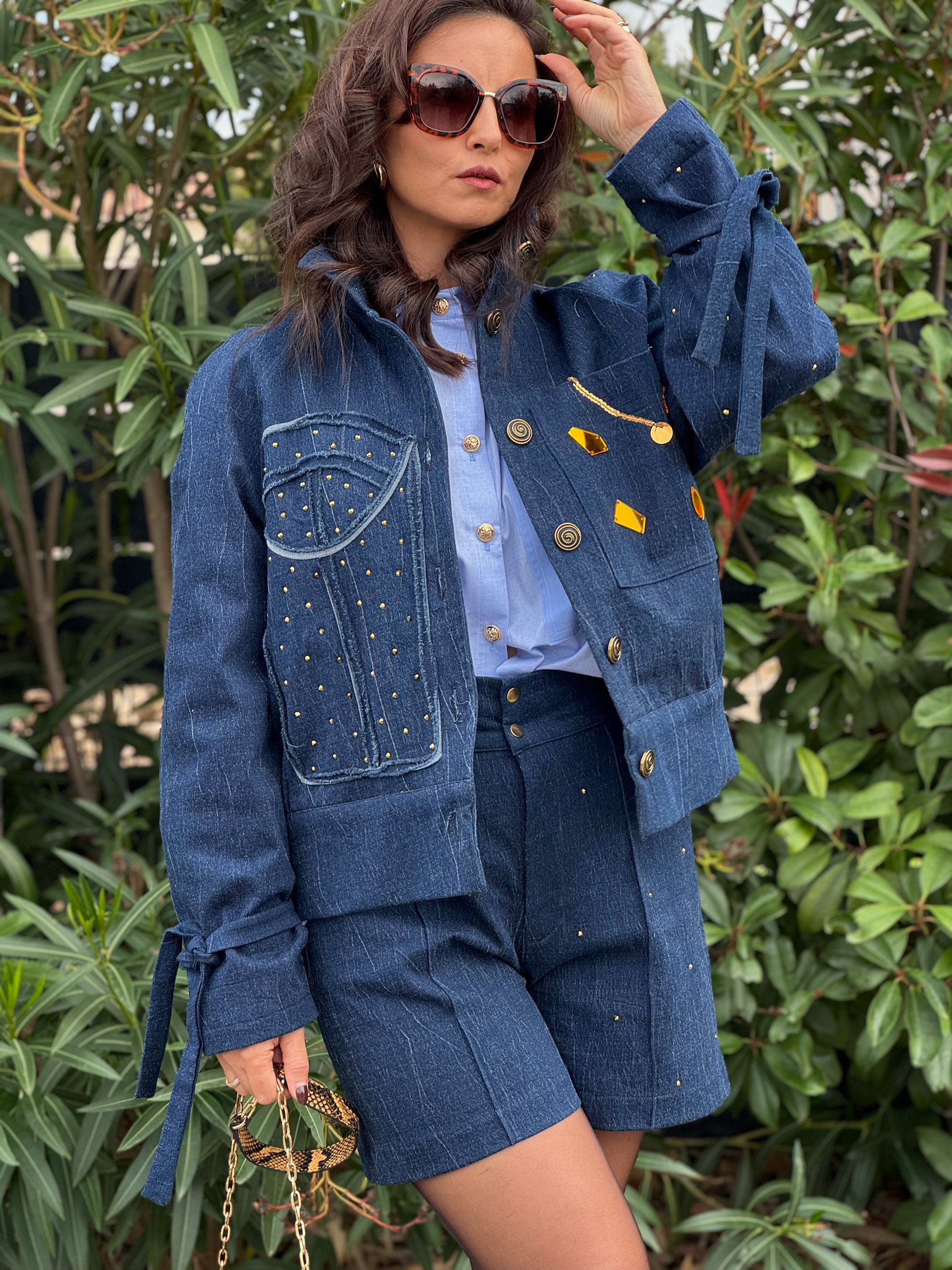 Cette veste bomber en denim est entièrement doublée pour plus de confort. Elle présente des détails uniques : des franges au dos et de petits miroirs appliqués à la main. Sur le devant, une poche est ornée de miroirs et de franges, tandis qu’un côté de la veste affiche un motif style corset en tissu, embelli de cristaux posés manuellement.