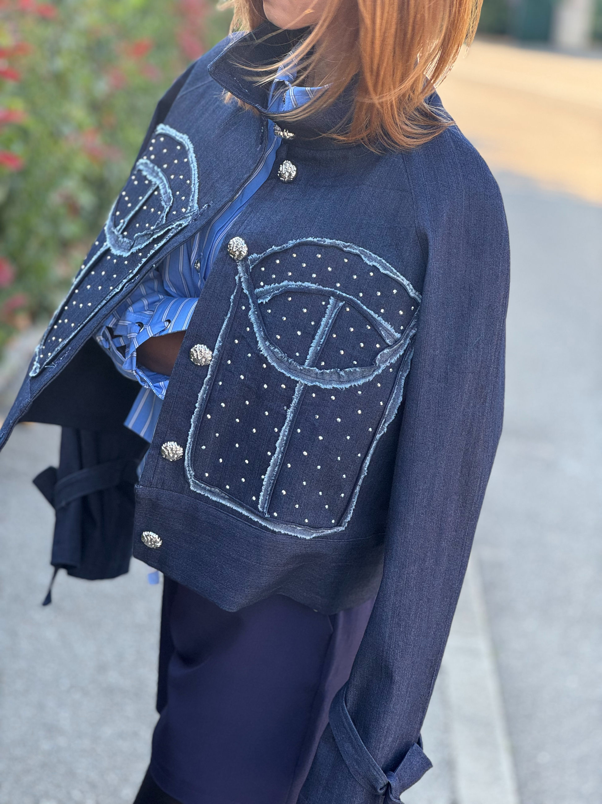 Veste en jean unique, ornée de cristaux faits main sur le devant et d’un style corset à lacets au dos. Poche pratique sur la manche et doublure légère pour un confort quotidien.